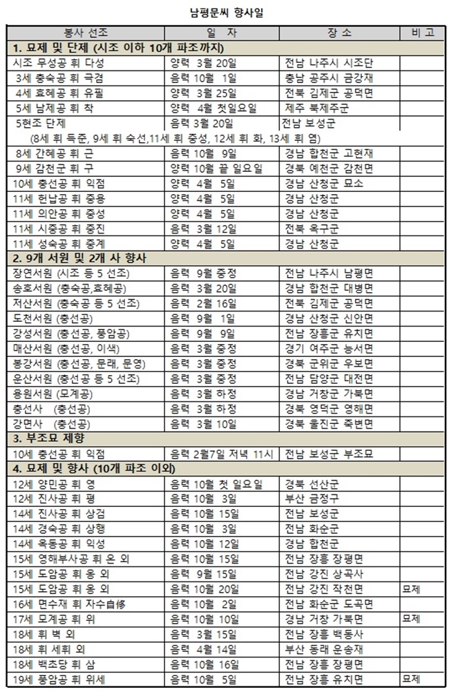 선조님의 제사는 선조를 추모함은 물론, 후손들이 서로 만나서 우의를 돈독히 하는 역할도 크다고 하겠습니다. 제사 날짜를 음력으로 하는 곳이 많아서 젊은 분들은 참석하기 어려운 문제가 있지만 식사는 하루에 3번 하면서 작년에 갔으니 올해는 빠져도 된다는 생각은 타당하지 않다고 봅니다. 제사는 묘에서 모시는 묘제, 또는 묘를 잃어버려 단을 설치하고 단에서 모시는 단제와 서원에서 모시는 제사로 구분되는데, 서원 제사는 유림에서 모시는 경우와 후손들이 직접 모시는 경우로 구분됩니다. 제사를 모시는 날짜로서 특이한 경우는 유림에서 행하는 서원제사 중, 정일(丁日)을 사용하는 경우가 있는데, 여기서 말하는 정일이란 간지(干支) 중 천간(天干)이 정(丁)인 경우를 말합니다. 정일은 전부 6번으로 정축일, 정묘일, 정사일, 정미일, 정유일, 정해일이 여기에 해당합니다. 정일은 다시 초정일, 중정일, 하정일이라는 표현을 많이 사용하는데, 초정일은 그 달의 초순(음력으로 1일~10일)에 있는 정일을, 중정일은 그 달의 중순(11일~20일)에 있는 정일을, 하정일은 그 달의 하순(21일~30일)에 있는 정일을 말합니다. 그 외 요즘에는 제사 날짜(이를 기일忌日이라고 합니다)를 음력이 아니라 양력을 사용하는 경우도 많이 있으니 기일이 음력인지 양력인지에 대하여도 확실하게 알고 있어야 합니다. 제사를 모시는 시간은 문익점 부조묘의 경우만 밤 11시에 모시며, 그 외는 모두 오시(午時), 즉 11시에 모십니다.